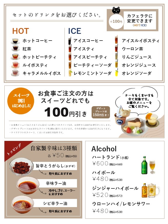 こちらの画像の定番のおうどんの他、季節ごとの日替わりうどん、らーめんが常時3~4種類ございます。